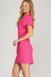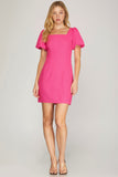 Acacia- Puff Short Sleeve Mini Dress- Hot Pink