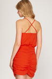 This sexy fitted dress in bold ferrari red will make a statement at any event. The cowl neckline and adjustable spaghetti straps provide a flattering and stylish look, while the rushing detailing and zip-up back add the perfect touch of detail. Plus, the blend of style and fit make this dress a must-have in your wardrobe.