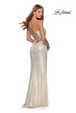 Turn heads in this long metallic prom dress with on trend knot detail. Features a plunging neckline, side leg slit, and intricate lace up back. Back zipper closure.
