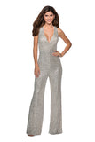 Dare to be different in this one-of-a-kind sequin jumpsuit for prom. Features a V shaped neckline and a criss cross open back. Back zipper closure.