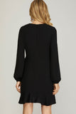 Dahlia - Long Sleeve Asymmetrical ruffled hem woven dress - Black