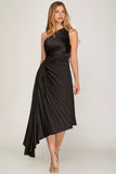 Daphne - One Shoulder Pleated Asymmetrical Woven Dress - Black