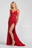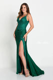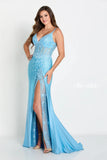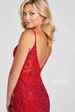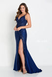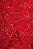 Captivate the room in this glitter prom dress with a square neckline, lace-up back, and a slit.