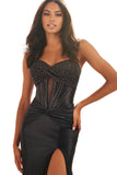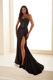Be the focal point of the night in Ellie Wilde Prom Style EW36045. The stretch knit fabric is accented with stones and features a corset bodice, slit, and stretch lining for a perfect fit. Make a statement and feel confident in this elegant and contemporary dress.