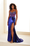 This Ellie Wilde Prom Style EW36061 boasts a Metallic Jersey fabric, adorned with Stone Accents, Beading, Sequin, and Pongee Lining. The Corset Bodice and Lace-Up Back add a sleek touch, while the Slit offers elegant movement. Make a statement with this stylish and sophisticated dress.