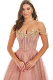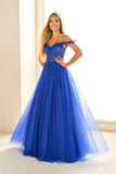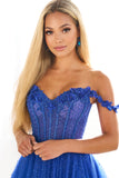 Stay on trend with the Ellie Wilde Prom Style EW36071! Made with stunning glitter tulle and lace applique, this dress is adorned with beautiful stone accents and intricate beading. Three-dimensional flowers add a touch of whimsy while the corset bodice and off-the-shoulder straps create a flattering silhouette. Perfect for making a statement at prom or any special occasion!
