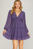 Gardenia- Long Sleeve Chiffon Tiered Dress- Purple