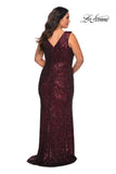 On trend fully sequined plus size prom dress with plunging V shaped neckline and wide shoulder straps. Back zipper closure.