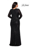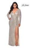 Head turning long sleeve curvy prom dress with head to toe sequins. Features a faux wrap bodice, plunging neckline, and side leg slit. Back zipper closure.
