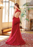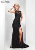 Lace fit and flare dress with illusion neckline, open back, front slit, and horsehair hem.