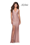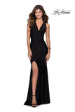 Figure flattering jersey prom dress that hugs your curves in all the right places. Features thick halter-like straps that leads to a stunning lace up tie back. A deep neckline and sultry side leg slit completes the look. Back zipper closure.