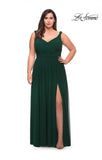 Simply elegant net jersey long plus size gown with slit. Bodice features ruching and V neckline. Back zipper closure.