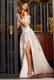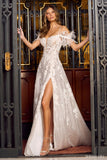 Machine sequin ball gown with corset top, off shoulder ostrich feather sleeves, high side slit, and lace up back.