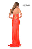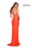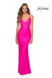 Bright and bold neon jersey prom dress with flattering all over ruching. This stand out dress features an intricate lace up back and draped neckline. Back zipper closure.