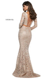 Metallic lace two piece gown featuring long sleeve bateau neckline top with lace up back, and long fitted skirt with hemline flare.