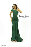 Modern and elegant stretch jersey dress with asymmetrical neckline. Ruching across the waist. Back zipper closure.