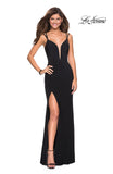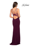A classic prom dress with double strap bodice and right side leg slit. A strappy detailed back makes this dress pop. Back zipper closure.