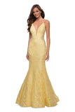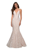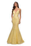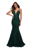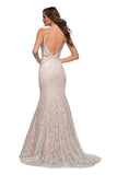 Slay prom in this one of a kind mermaid lace prom dress by La Femme. A plunging V-shaped neckline, low scoop open back, and dazzling sheer rhinestone back design make this look a perfect 10. Back zipper closure.