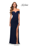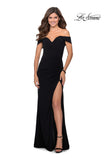 Off the shoulder floor length prom dress featuring beautifully draped sleeves and ruching. Back zipper closure.