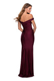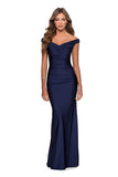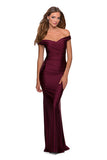 Elegant long prom dress with ruching for a flattering effect. Features an pleated off the shoulder sweetheart bodice. Back zipper closure.