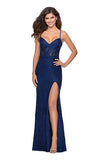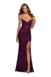 Unique and on trend long lace prom dress. Features a sheer bodice with soft V neckline and scattered rhinestone detailing. A lace up open back completes the look. Back zipper closure.