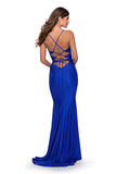Trendy lace up back prom dress with triple knotted detail bodice by La Femme. This sleek jersey gown features a unique plunging sweetheart neckline. Back zipper closure.