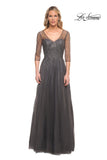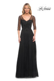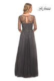 Enchanting tulle evening gown with beautiful scattered beading throughout the dress. The dress features sheer sleeves and neckline. Back zipper closure.