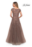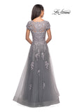 Stunning tulle gown with fully lace bodice and cascading lace appliques. Features short sleeves and rhinestone detailing. Back zipper closure.