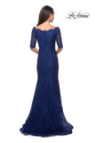 Long lace gown with soft V shaped neckline and three quarter sleeves. Features scattered rhinestone detailing. Back zipper closure.