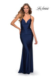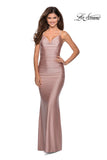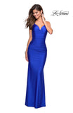 Form fitting long jersey dress to impress at prom. This fully ruched gown features a sweetheart neckline and cool strappy back. Back zipper closure.