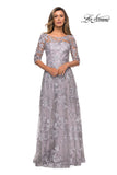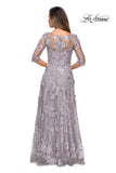 Long three quarter sleeve A-line evening gown with high sheer scoop neckline and intricate floral lace design. Back zipper closure.
