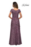 Gorgeous long lace evening gown for the mother of the bride or groom. This design features cap sleeves and a soft V neckline. Back zipper closure.