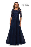 Three quarter sleeve A-line tulle gown with dazzling beaded floral appliques. A sheer scoop neckline and sheer sleeves add a unique touch. Back zipper closure.