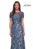 Elegant floor length floral beaded evening dress with sheer neckline and cap sleeves. Features a sheer back and defined waist. Back zipper closure.
