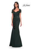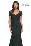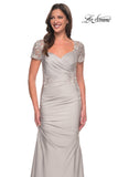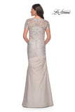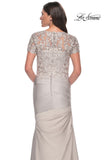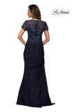Stunning satin formal gown for the mother of the bride or groom. Features sheer three quarter sleeves and a scoop neckline. The bodice is adorned with beautiful lace applique detail. Back zipper closure.