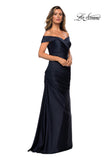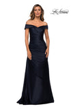Timeless off the shoulder satin evening gown with beautiful pleated detail and a detailed neckline. Back zipper closure.