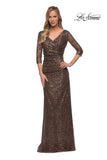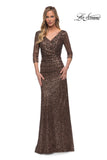 Long sequin gown with V neckline and sheer three quarter sleeves. Ruching across front and back of dress. Back zipper closure.