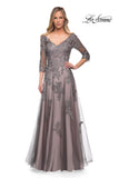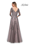 A-line style long lace gown with gray lace and pink lining. The dress features sheer three quarter sleeves and a V neck and back. Back zipper closure.