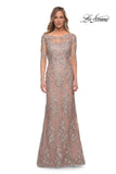Column style long dress with beautiful lace applique throughout. Sheer high neckline and three quarter sleeves. Back zipper closure.