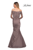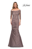 Long mermaid gown with jersey skirt and flattering pleating throughout. Bodice features embroidered lace and scallop detailing on neckline. Sheer three quarter sleeves. Back zipper closure.