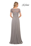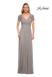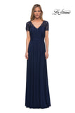 Long jersey gown with V neckline and ruching. Dress features sheer lace sleeves and back. Back zipper closure.