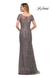 Intricately beaded column style gown with sheer neckline and short sleeves. Back zipper closure.