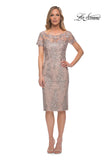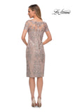 Knee length dress with beautiful lace appliques throughout. Sheer high neckline and short sleeves. Back zipper closure.