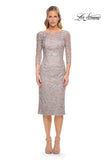 Fitted lace below-the-knee dress with illusion top. Three-quarter sheer lace sleeves and slight V back. Back zipper closure.