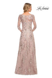 Beautiful metallic lace gown with full skirt and V neckline. Illusion lace three-quarter sleeves. Back zipper closure.