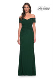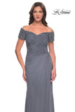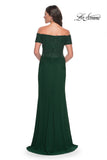 Exquisite net jersey gown with off the shoulder top and short sleeves. Beautiful beaded design on the back and sleeves. Back zipper closure.