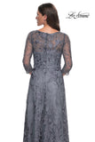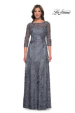 Long dress with beautiful lace fabric. High illusion neckline and sheer lace three quarter sleeves. Back zipper closure.