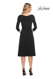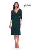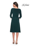 Simple jersey tea length dress with flare skirt. Ruching across waist, V neckline, and three-quarter sleeves. Back zipper closure.