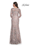 Beautiful lace dress with mermaid style skirt and V neckline. Sheer three quarter sleeve. Back zipper closure.