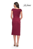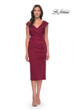 Chic off the shoulder jersey dress with pleating and below-the-knee length. Back zipper closure.